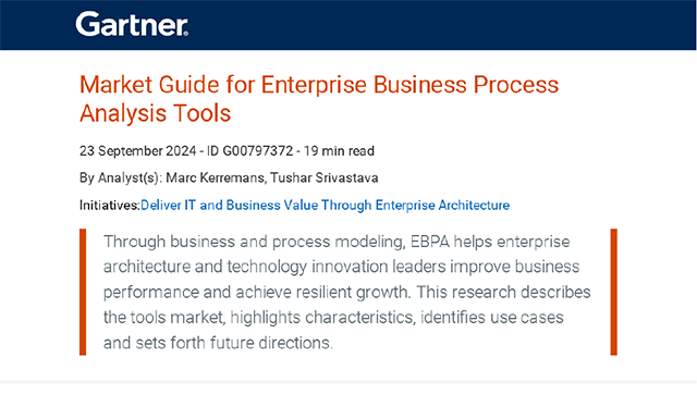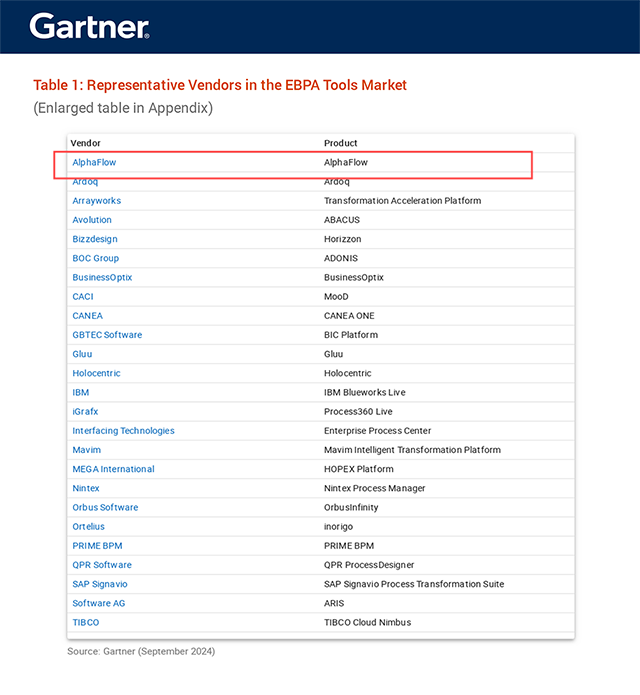 This week, Gartner, the world's leading IT research and advisory firm, released its 2024 Market Guide for Enterprise Business Process Analysis (EBPA) Tools. AlphaFlow was selected as one of the 25 global process software vendors, alongside Software AG (ARIS), IBM, SAP, and others, to be included in the list of representative EBPA vendors. AlphaFlow is the first and only product from China to be included in this prestigious list.